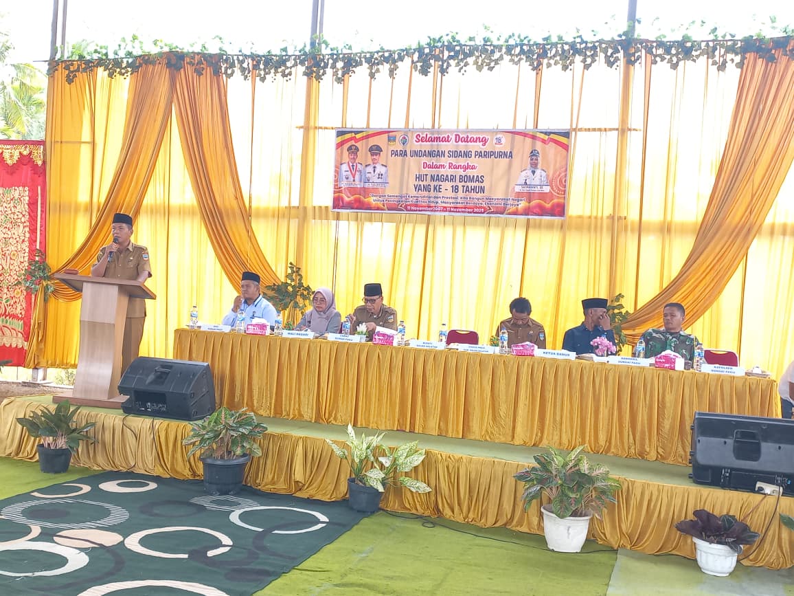 Pada hari Selasa, 11 November 2025, bertempat di Hall Mato Aia Nagari Bomas Koto Baru, Kecamatan Sungai Pagu, Kabupaten Solok Selatan, dilaksanakan Kegiatan Peringatan Hari Ulang Tahun Nagari Bomas yang ke-18 Tahun. Acara ini menjadi momentum penting bagi seluruh masyarakat Nagari Bomas untuk mengenang perjalanan pembangunan nagari sekaligus memperkuat semangat kebersamaan dalam mewujudkan nagari yang maju, mandiri, dan berdaya saing.